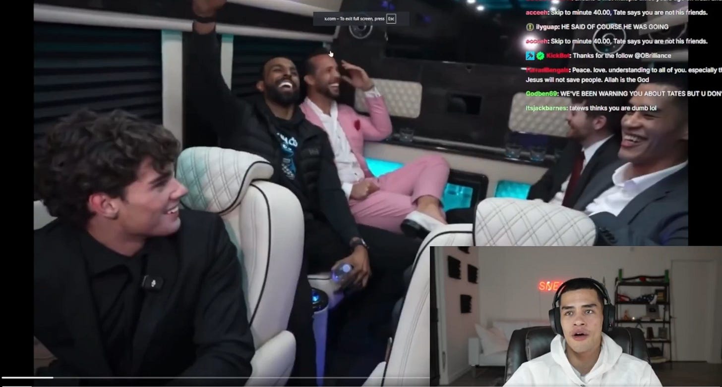 The stream continues and the rest of the boys pile in, white lights still blaring down and making them all look like shit. According to the Tate Brothers, Sneako grabbed a phone from Justin Waller’s hand and played Kanye’s Heil Hitler for the first time that evening, like a teenager hijacking the aux to play Crazy Frog at the function. The boys rejoiced in this gag and began singing along. Myron Gains, a Sudanese man pushing 40, began sieg heiling to the beat attempting to impress men who are ten years younger than him.